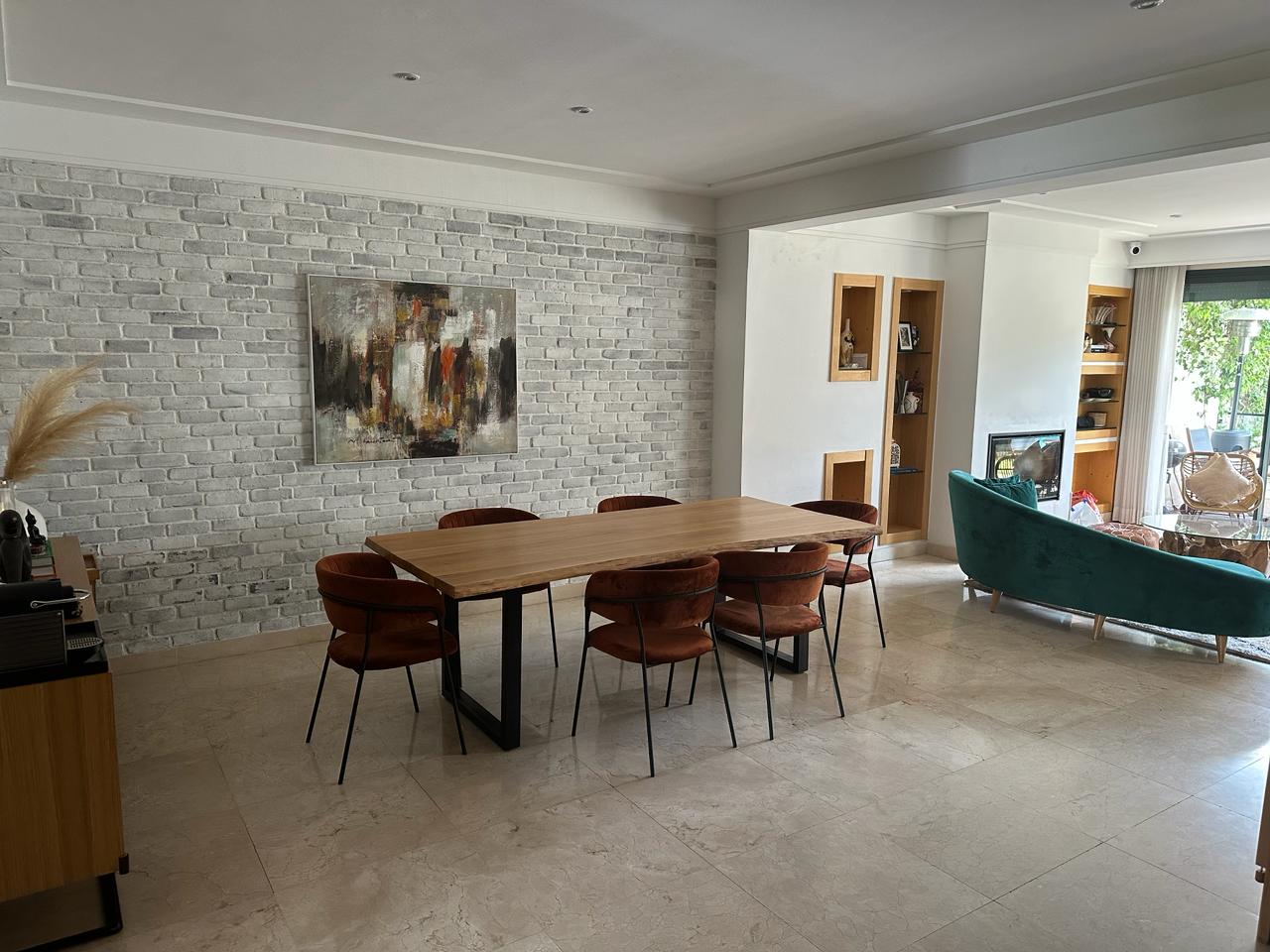 – Salon ouvert sur le jardin et la piscine, coin cheminée avec salle à manger